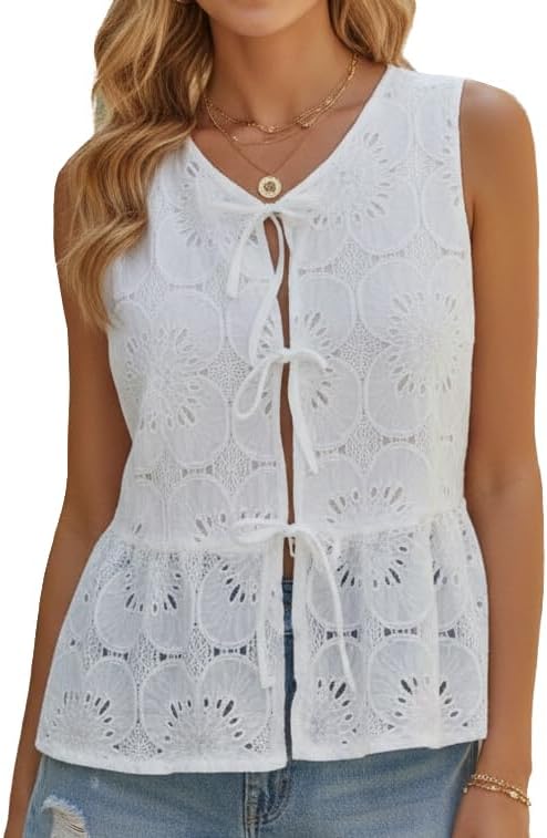 Remidoo Womens Tie Front Peplum Tank Top Eyelet Embroidered Boho Sleeveless Blouse