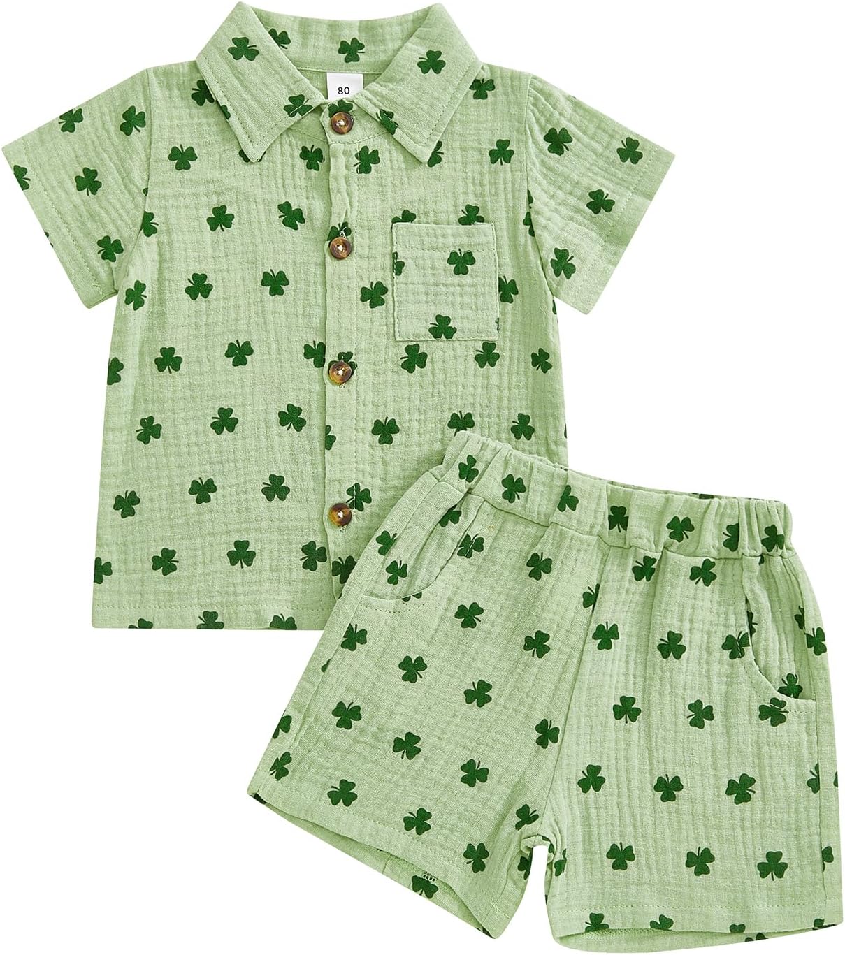 Toddler Baby Boy St Patricks Day Outfit Clover Cotton Linen Button Down Short Sleeve Shirt Shorts Set Irish Clothes