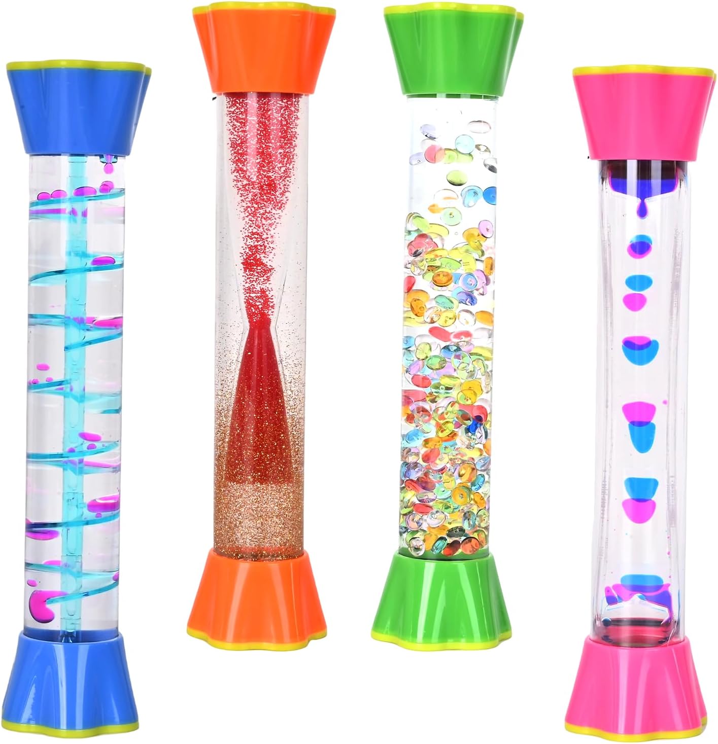 - SENSORY SET: Complete set of 4 different liquid motion toys featuring glitter hourglass, rotating slide tube, colorful reverse candy tube, and two-color vision tube designs