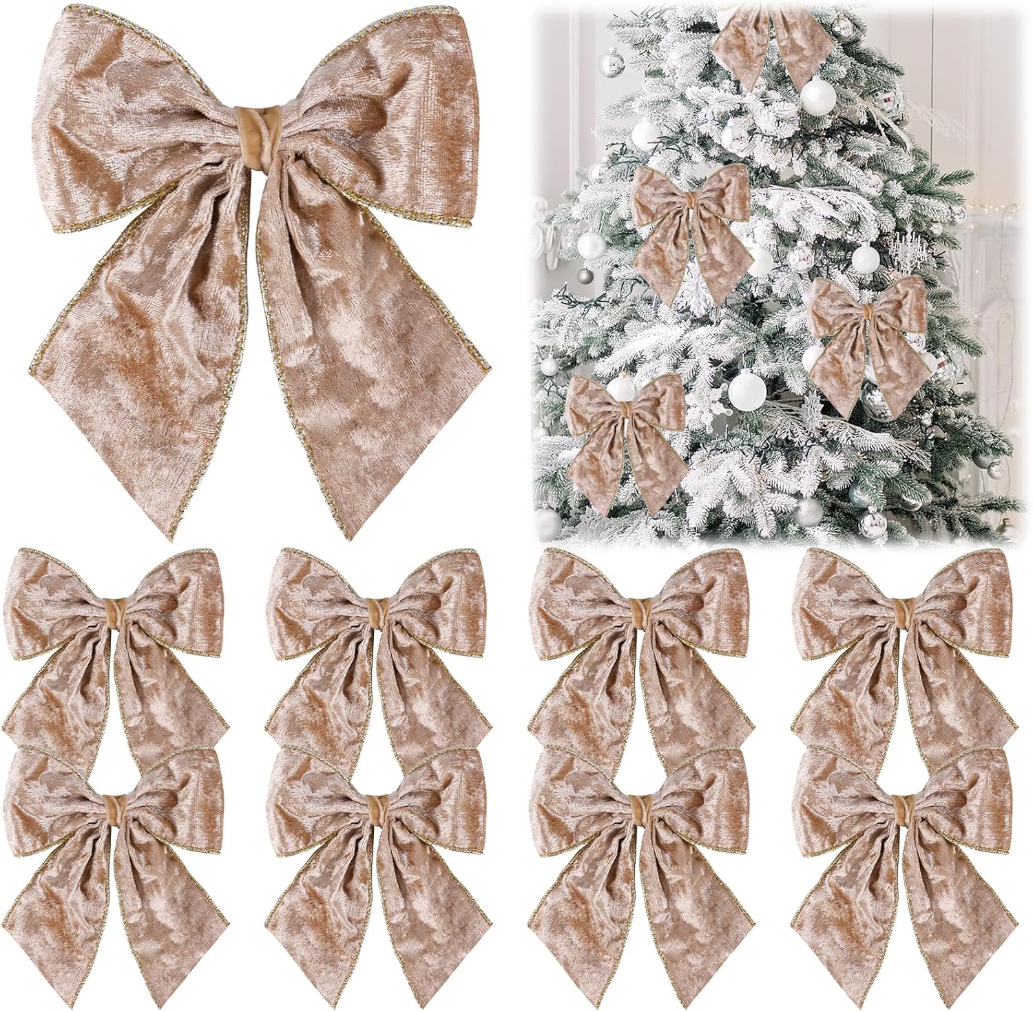 - Wide Application: The champagne velvet Christmas bows are perfect for Christmas party decoration,Christmas tree topper,New Year's DIY crafts,home decoration,winter parties,clothing accessories, Christmas gift wrapping,Christmas DIY craft decoration,winter wedding,window display and so on.