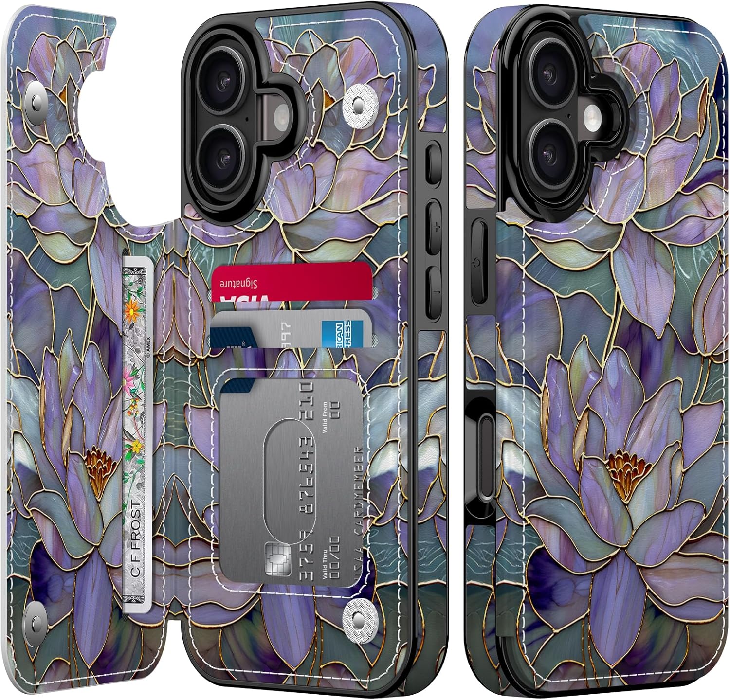 FUNMIKO for iPhone 17 Wallet Case with Card Holder, RFID-Blocking, Military-Grade Protection & UV-Printed Artwork, Magnetic Closure with Leather Kickstand - Dreamy Lotus