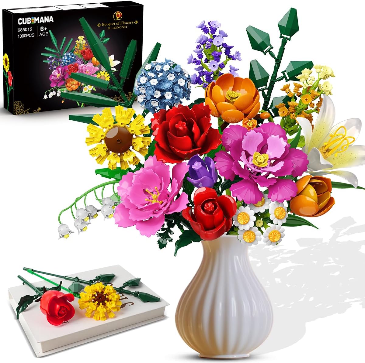 - 15 Artificial Flowers - NO VASE: Let your creativity blossom in nature with the CUBIMANA flower bouquet building block set, 15 brightly colored flowers will bring sunshine and charm to your home! These include roses, daisies, sunflowers, bellflower, eustoma, carnations, peonies, lilies, violets, camellias, tulips, hydrangeas, and each petal is carefully designed to bring a truly realistic floral experience.(PLEASE NOTE THAT THE VASE IS NOT INCLUDED)