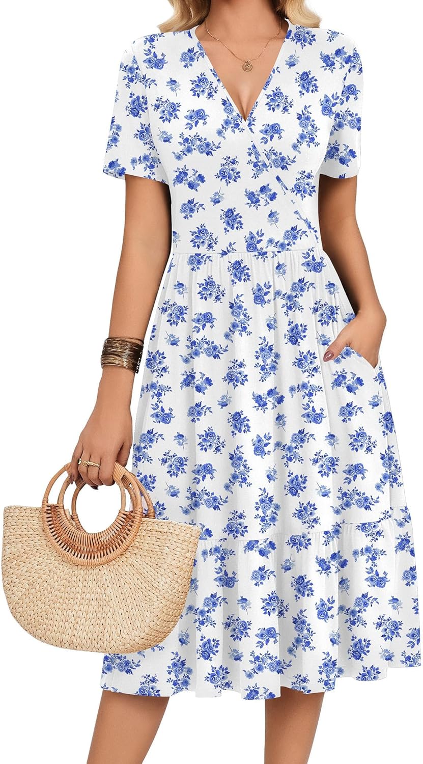 Zeagoo Womens Summer Warp V-Neck Casual Dresses Short Sleeve Midi Floral Dress with Pockets Tiered Flowy A Line Sundress