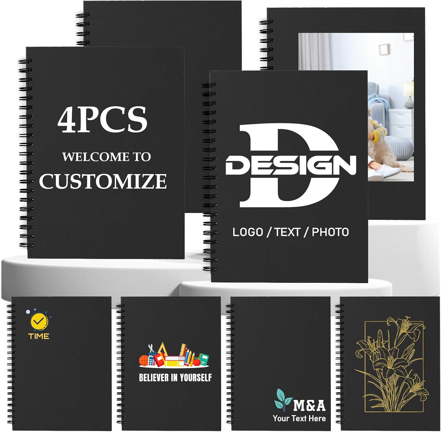 Custom Spiral Notebook - Upload Your Own Photo/Logo/Text, Set of 4 Personalized Journals, A5 Kraft Soft Cover, 120 Pages, 8.4 x 5.8 Inch, Customizable Notebooks for Gifts, Office or Business, Black