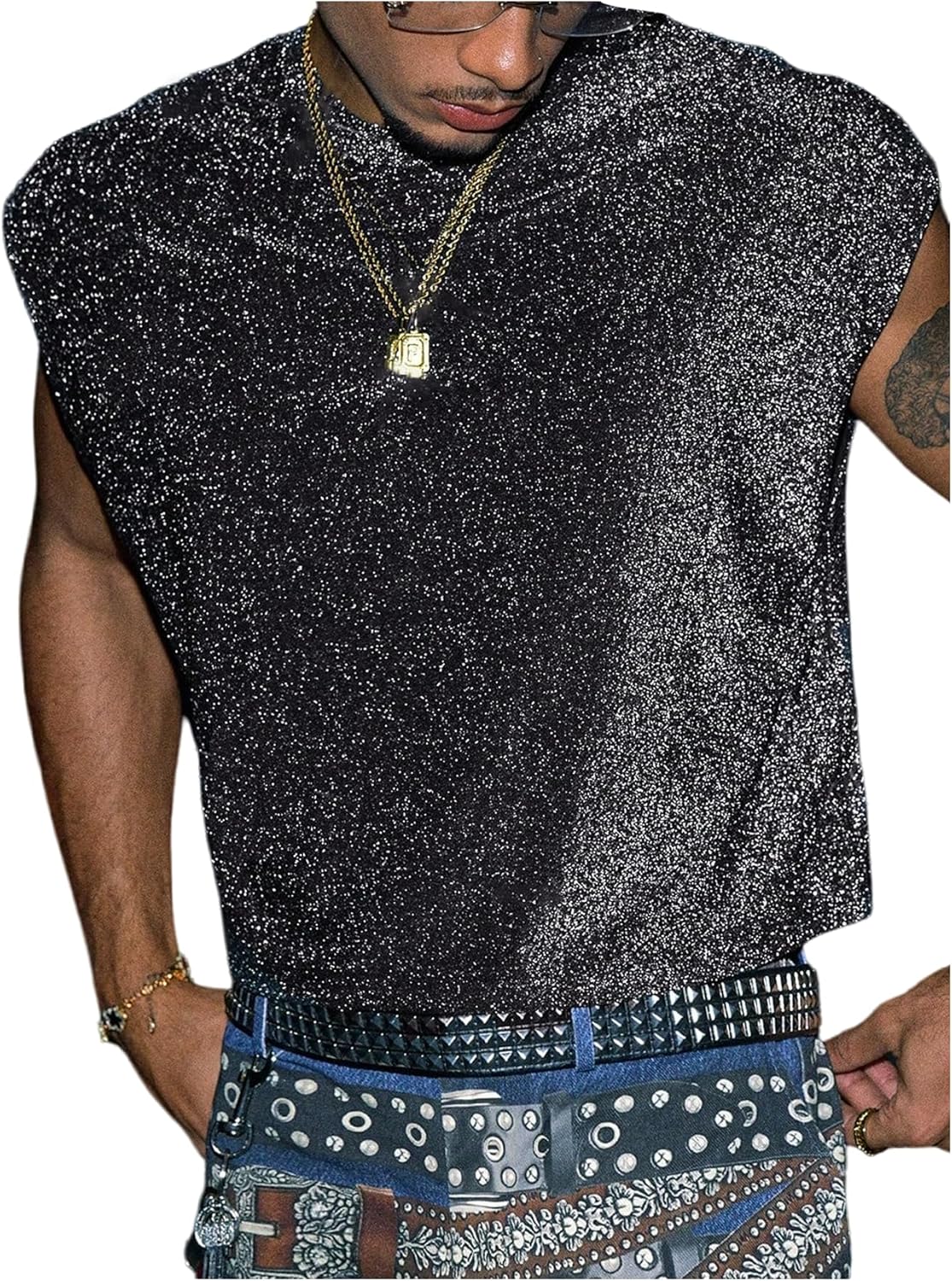 Men's Sequin Tank Top Glitter Crew Neck Sleeveless Tops Party Club Vest Rave Outfits Streetwear