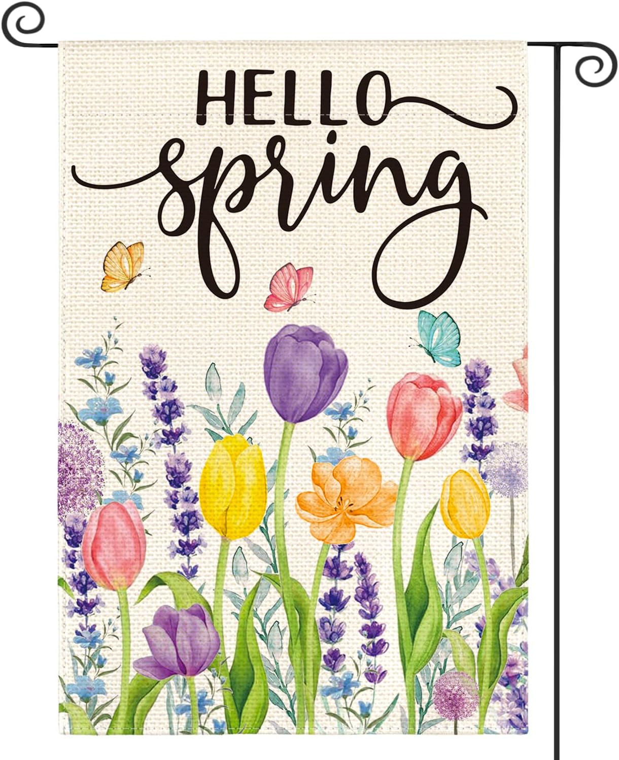 AVOIN colorlife Hello Spring Tulip Lavender Garden Flag 12 x 18 Inch Double Sided, Seasonal Flower Yard Outdoor Flag