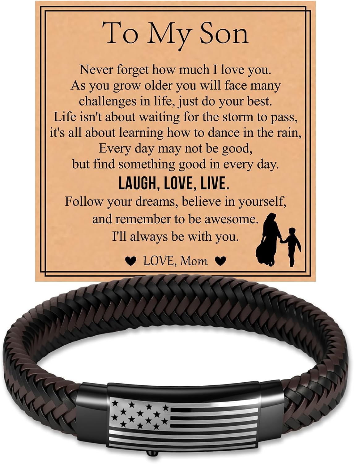 Leather Bracelet for Men American Flag Mens Leather Bracelet with Card Adjustable Leather Cuff Bracelets for Men Jewelry Gifts for Dad Son Brother Man Husband Boyfriend