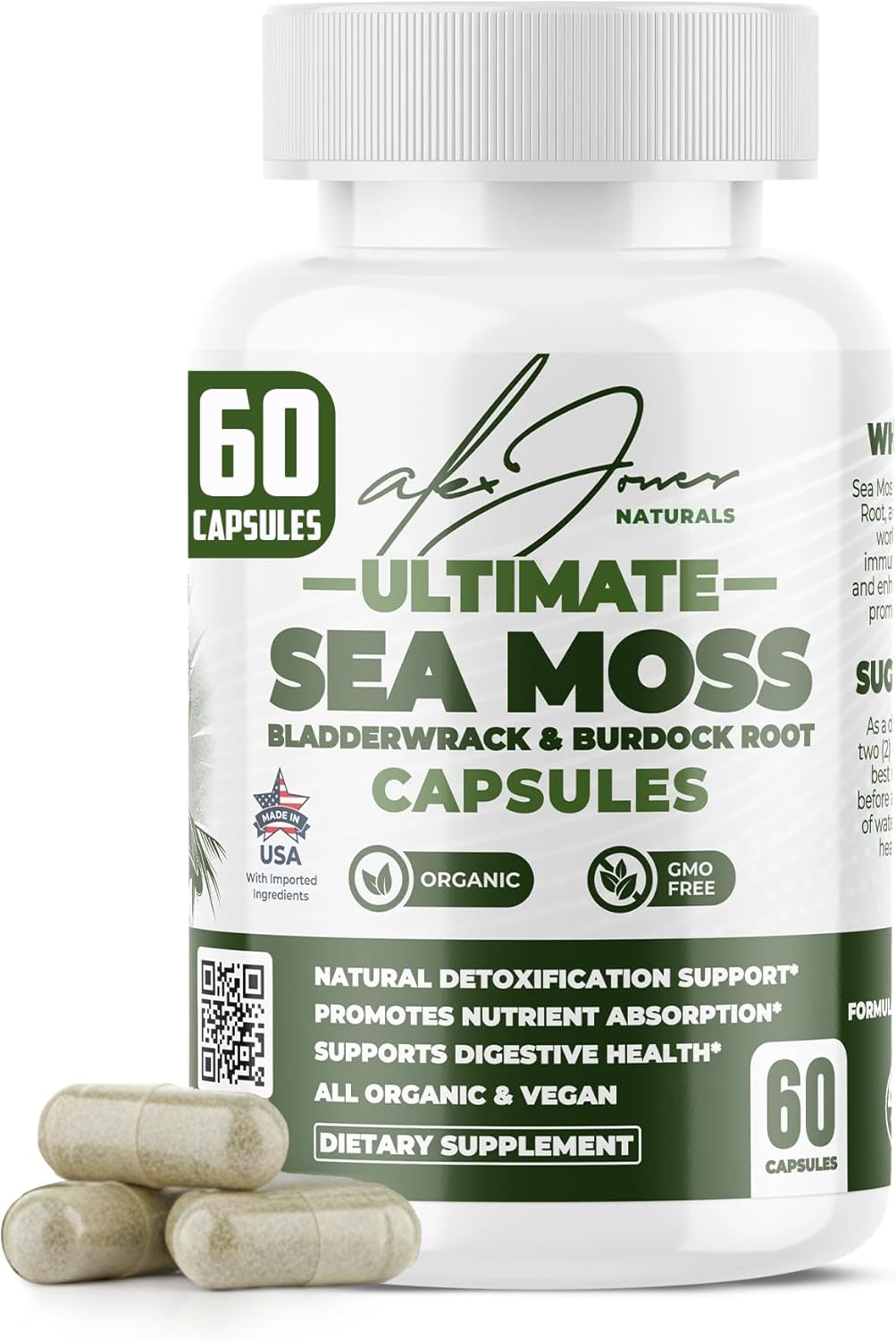 Alex Jones Ultimate Seamoss Capsules – Vegan, Non-GMO Seaweed Supplement w/Bladderwrack & Burdock Root – Immune Boost, Energy Support Sea Moss Supplements for Men & Women - 60 Nutrition Support Pills