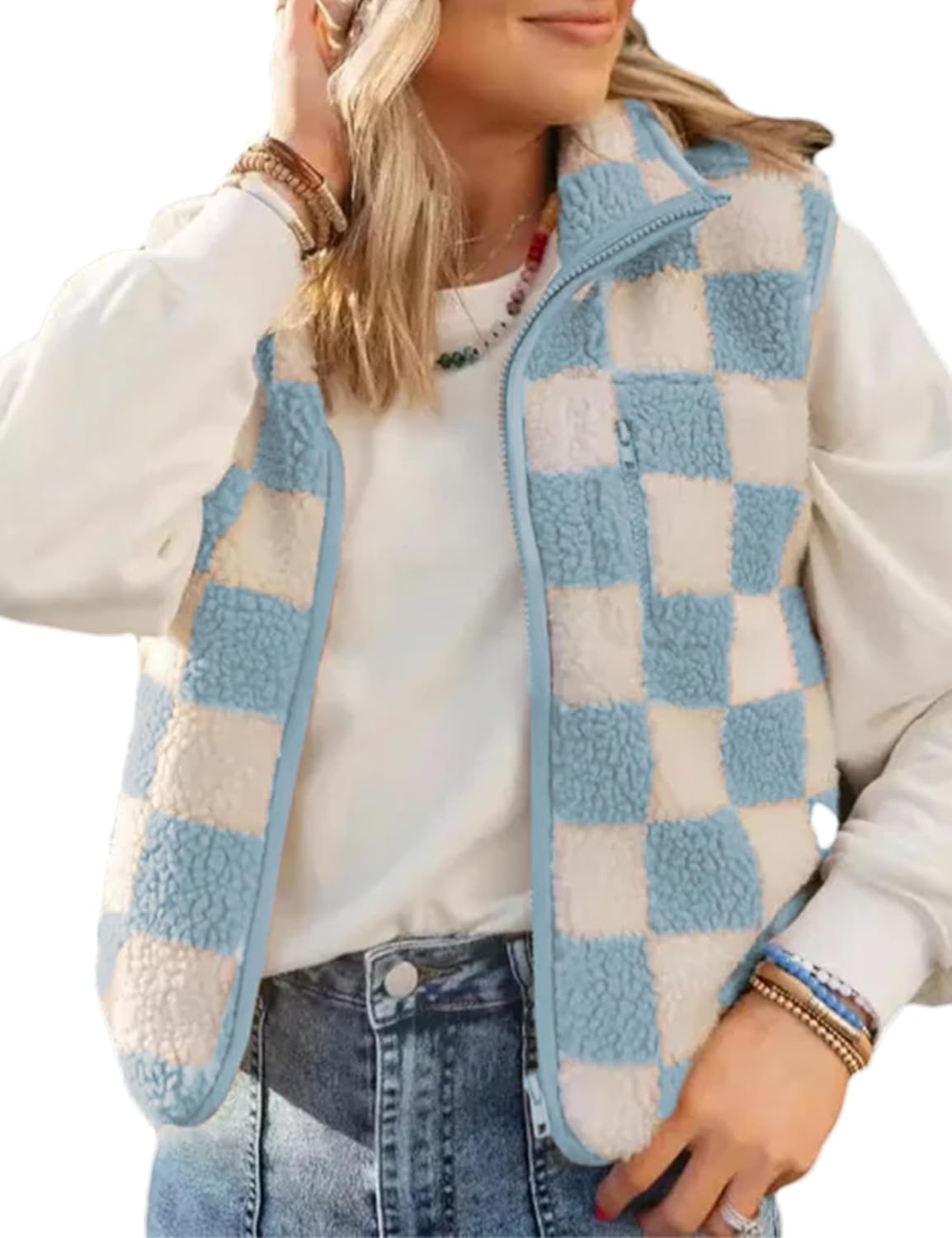 Sherpa Vest for Women Sleeveless Fuzzy Fleece Checkered Jacket Warm Casual Gilet Outerwear with Zipper