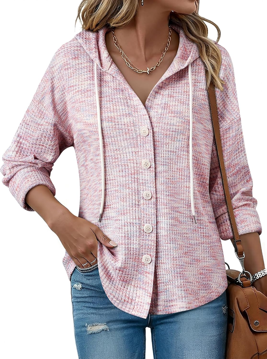 ZXZY Waffle Knit Tops for Women Casual Long Sleeve Button Hooded Sweatshirts Hoodies