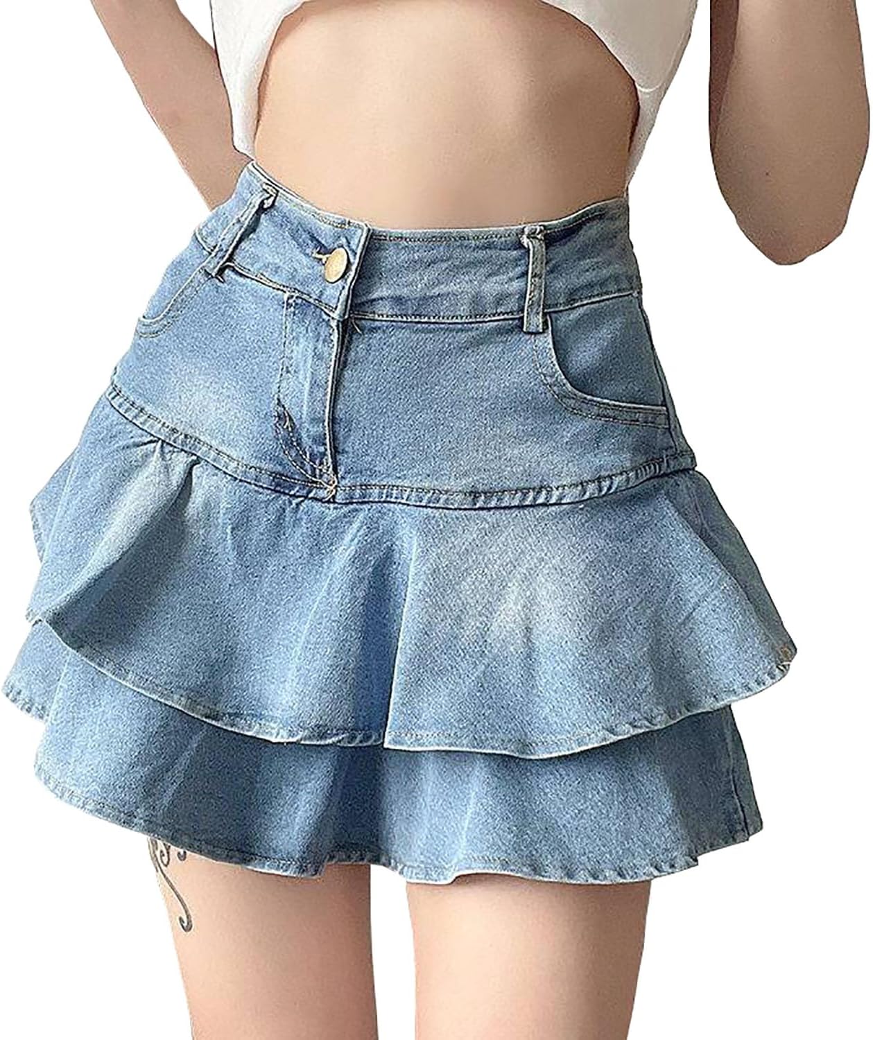 SHSEMO Women's Ruffle Multi-Layer Denim Skirt Casual A-Line Ruffle Y2K Mini Denim Skirt (US, Alpha, One Size, XX-Large, Regular, Regular, Blue)