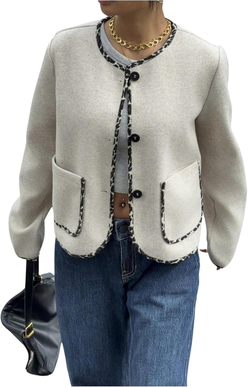 GORGLITTER Women's Cropped Jacket Button Up Leopard Trim Fall Dressy Long Sleeve Crew Neck Coat with Pockets