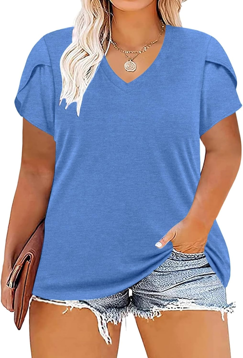 TAKEYAL Women's Plus Size T Shirts Petal Sleeve V Neck Tee Tops Summer Cute Baggy Casual Blouses XL-5XL 2024
