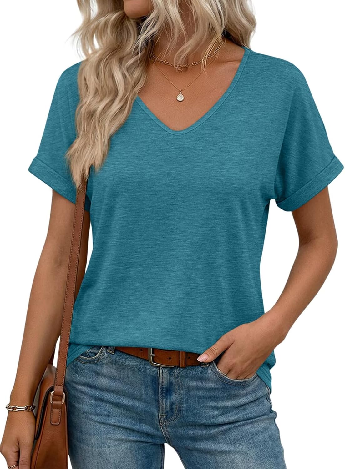 EADINVE Womens V Neck Rolled Sleeve T Shirts Curved Hem Short Sleeve Tops Summer Trendy Tees Loose Fit Tunic Shirts 2026