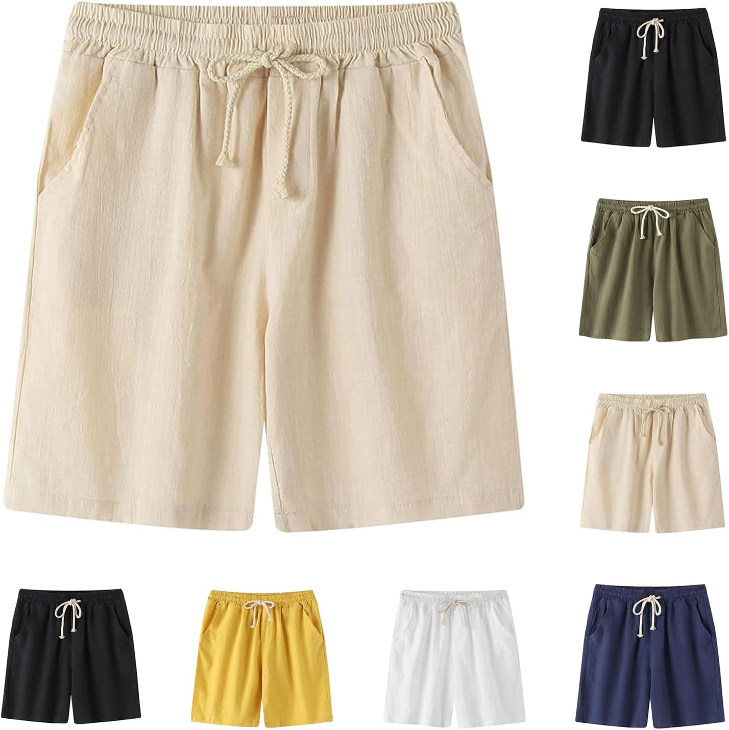 Men's Linen Cotton Shorts 5 Inch Inseam Drawstring Elastic Waist Lightweight Casual Summer Beach Shorts with Pocket