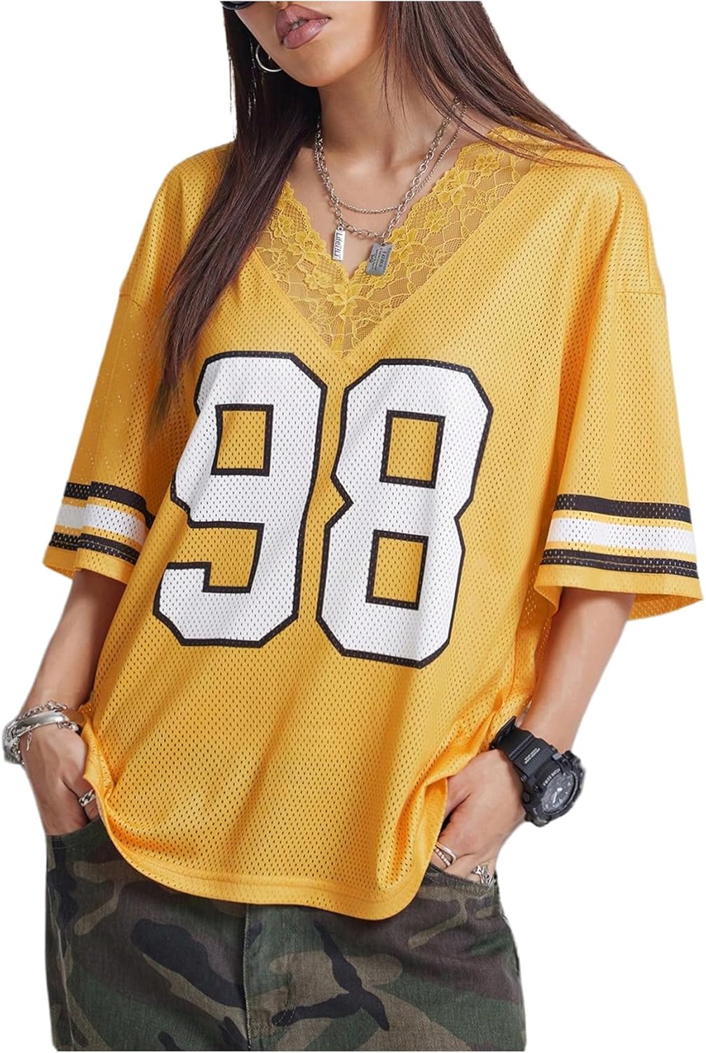 Floerns Women's Y2k Number Jersey Shirt Lace Trim Half Sleeve Oversized T Shirts