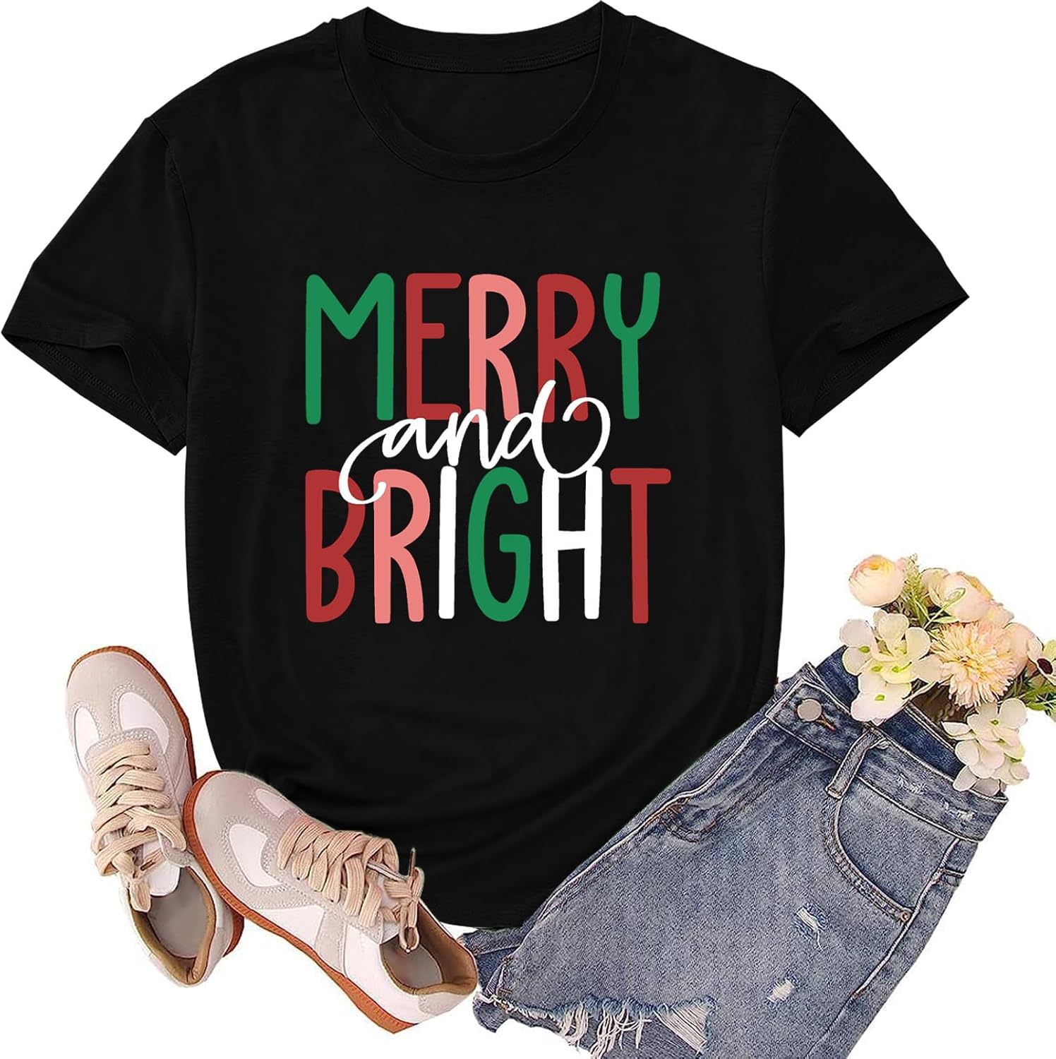 Christmas Shirts for Women Merry and Bright Tshirts Merry Christmas Shirt Xmas Holiday Tee Tops
