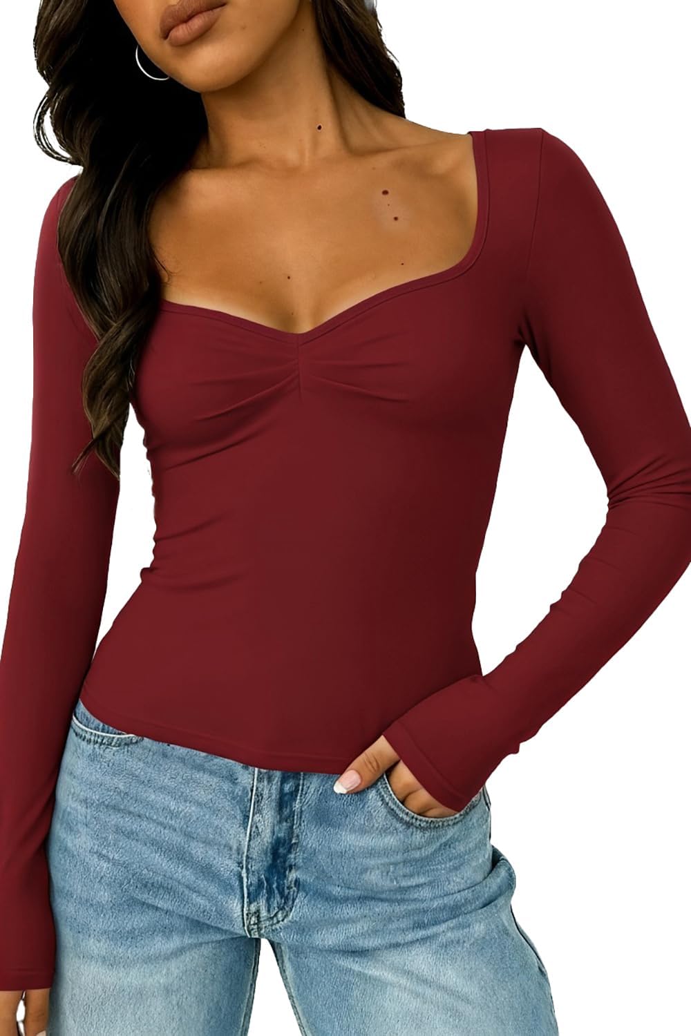 ForeFair Women's Long Sleeve Going Out Tops Pleated Basic T Shirts Cute Sweetheart Neck Y2K Fall Tops