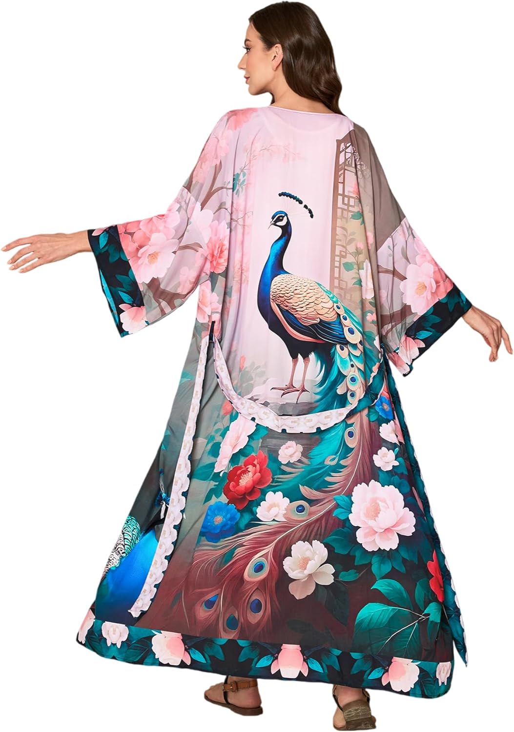 Swimsuit Coverups for Women Long Kimonos Robes Peocock Flower Printed Boho Beach Cover Ups Summer Holiday Sarong Wraps