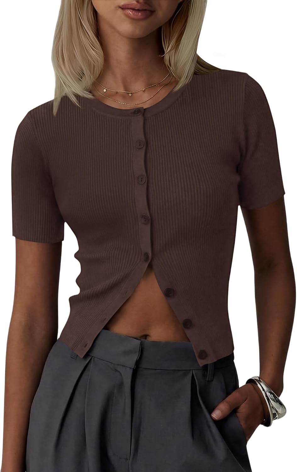 Kistore Womens Casual Summer Short Sleeve Sweater Cardigan Button Down Crew Neck Knitted Crop Cardigan Tops