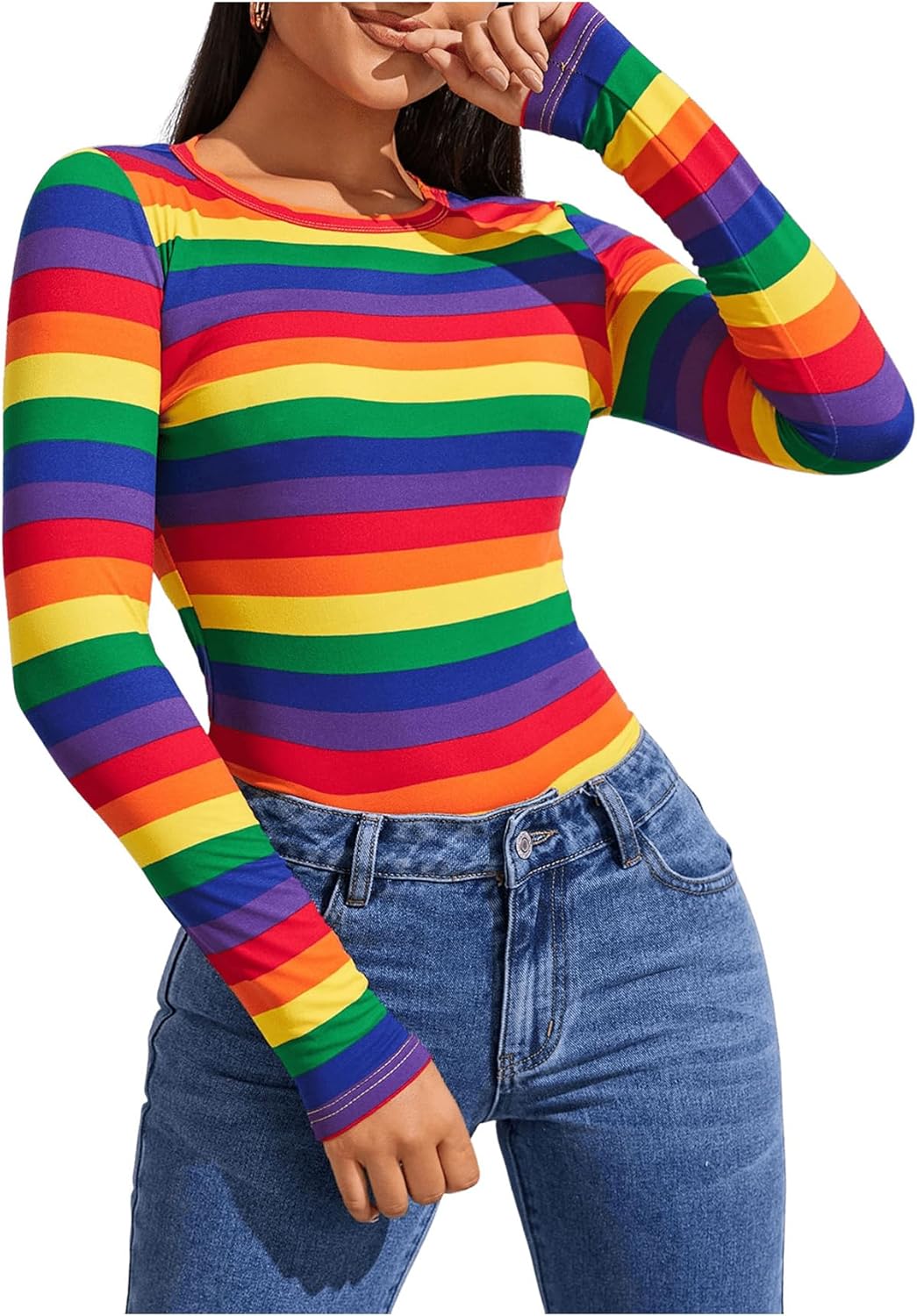 Floerns Women's Rainbow Striped Long Sleeve Round Neck Slim Fit Casual Tee Shirt Top