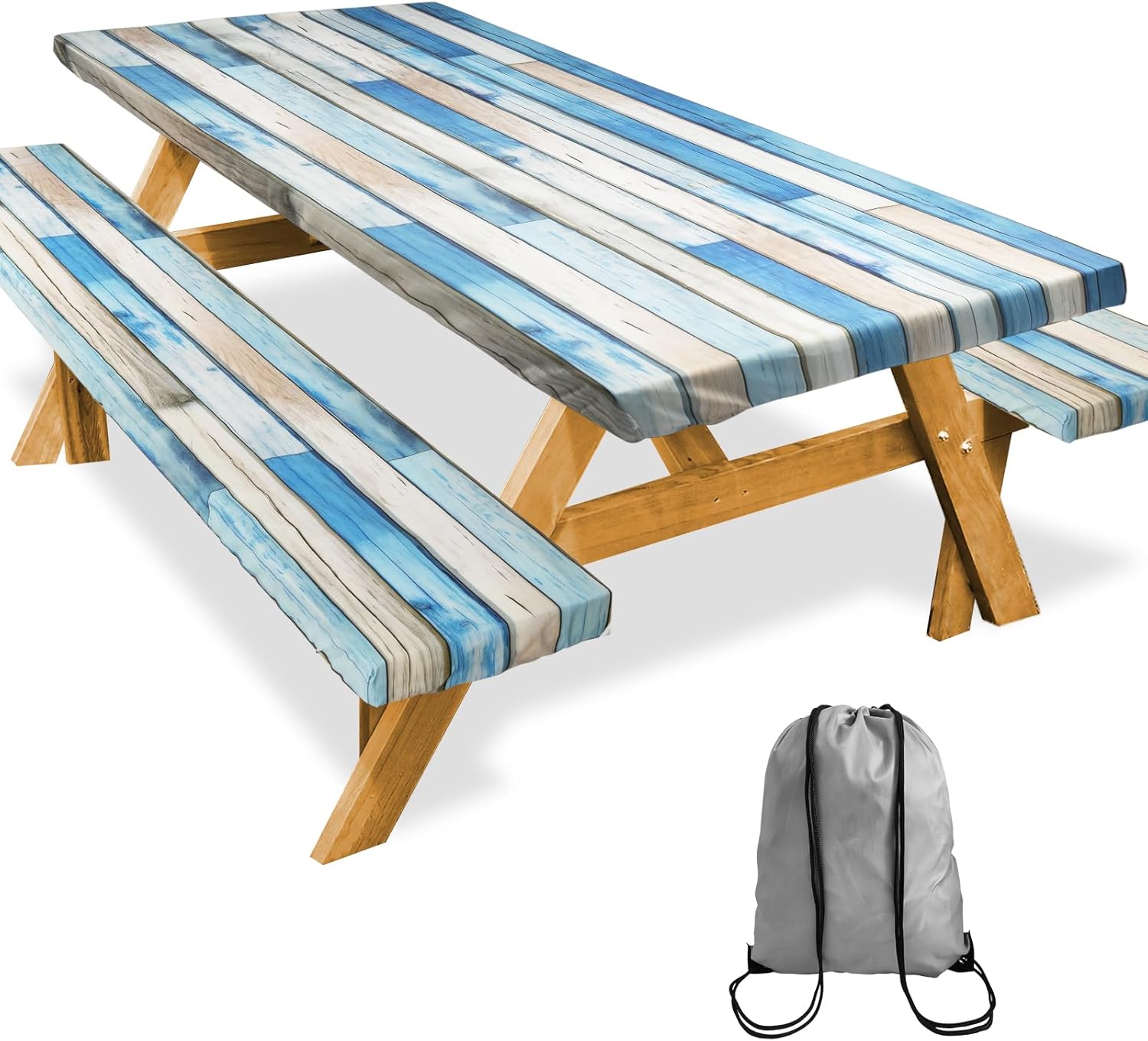 Picnic Table Cover with Bench Covers 72in Camping Essentials Reusable Waterproof Windproof Camping Tablecloth Fitted Rectangle Tables and Seats, Blue White Wood