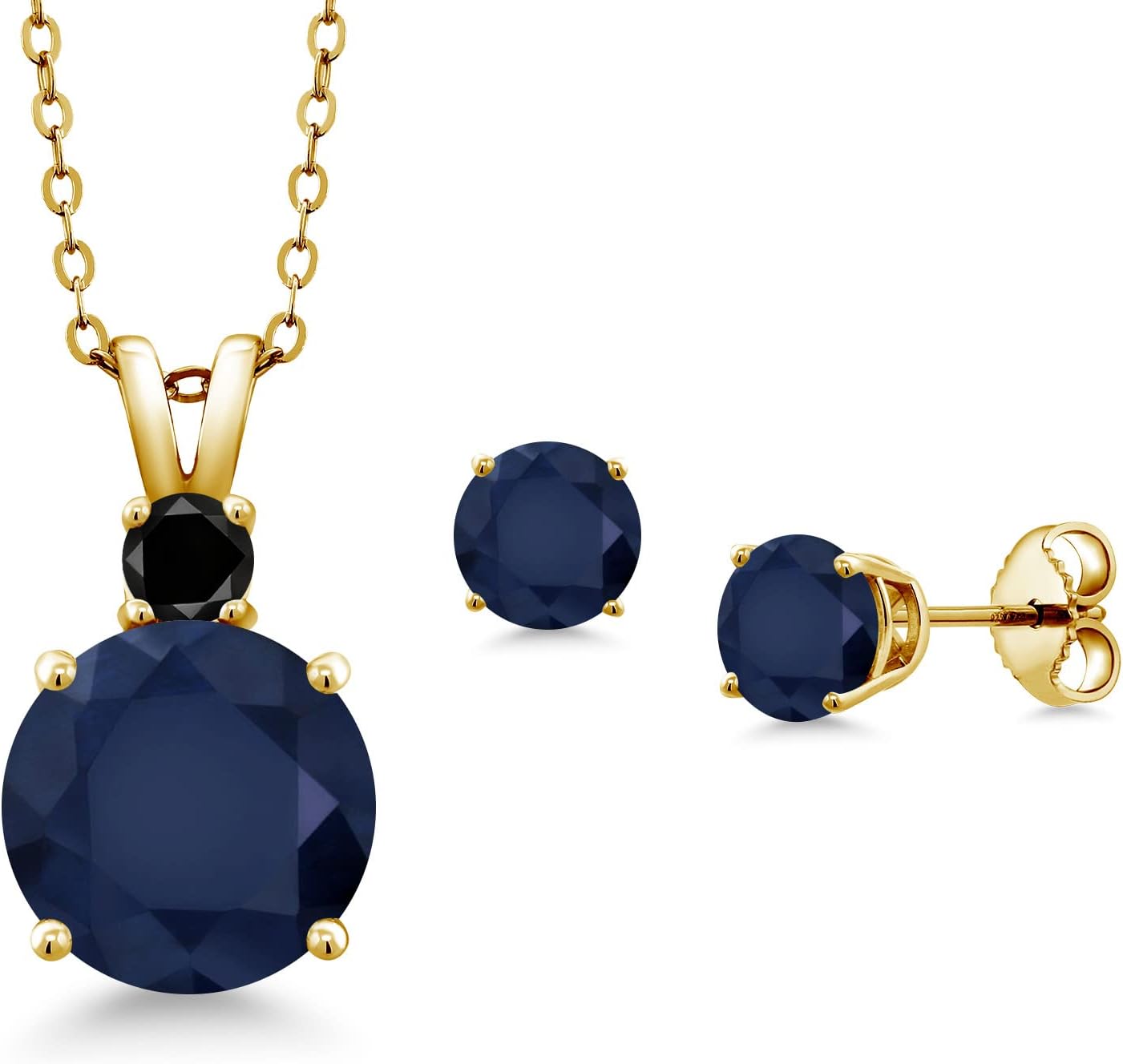 Gem Stone King 18K Yellow Gold Plated Silver Round Blue Sapphire and Black Diamond Pendant and Earrings Jewelry Set For Women (6.32 Cttw, Gemstone Birthstone, with 18 Inch Chain)