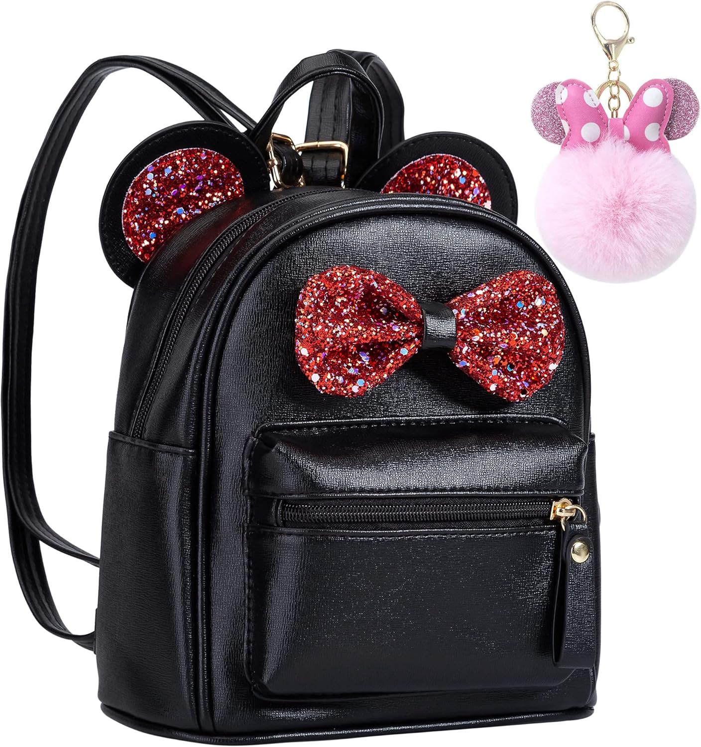 Sunwel Fashion Cutest Toddler Bag Sequin Bow Mouse Ears Mini Backpack for Teen Little Girls with Pom Pom Keychain (black/red bow)