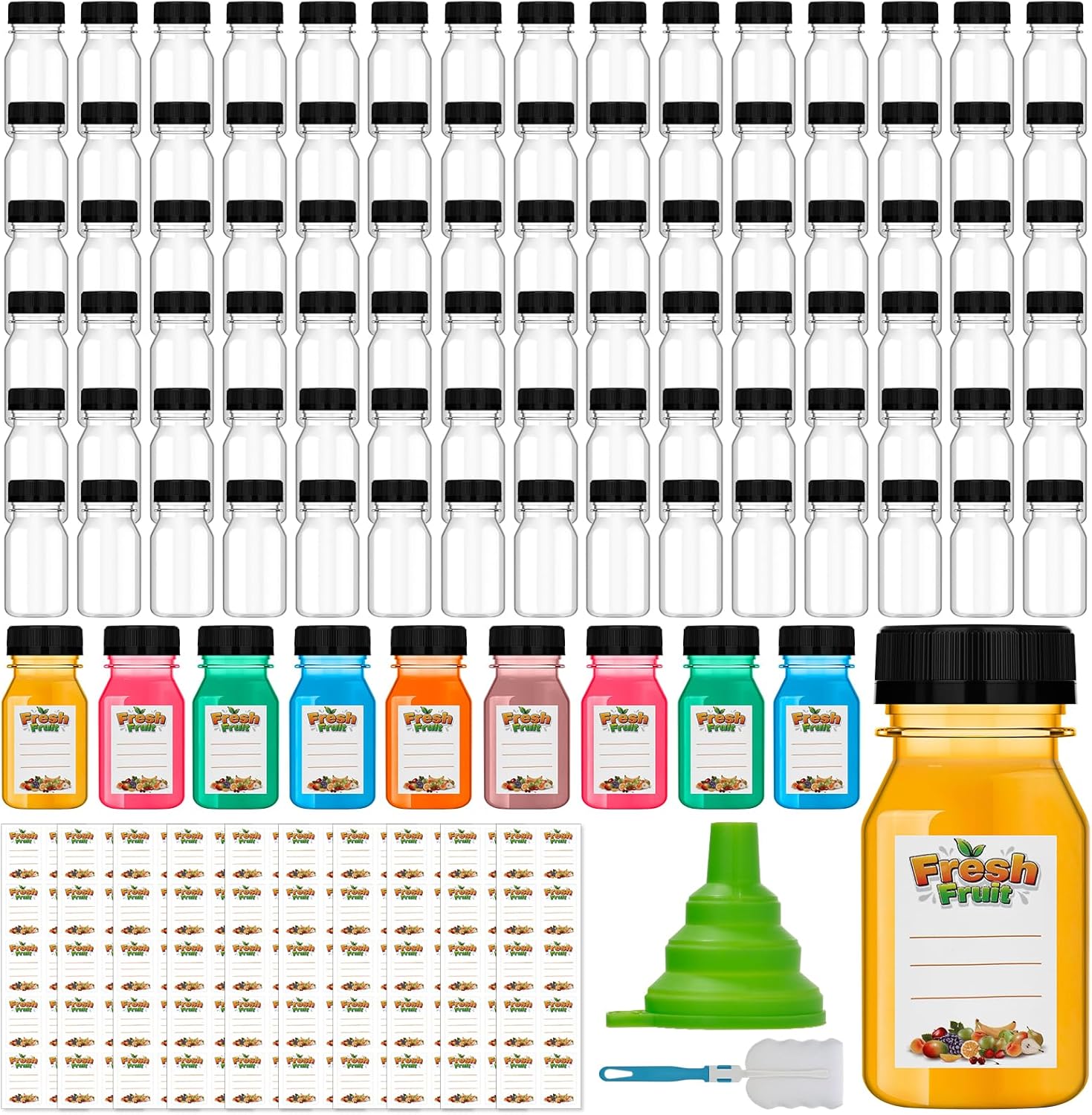 - Package Include:100 Pcs 4oz plastic wide mouth shot bottles, 100 leak-proof lids, 100 labels, 1 cleaning brush, 1 silicone funnel, sufficient quantity can meet your different daily needs and replacement