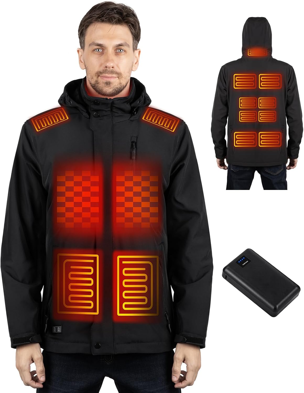 Heated Jacket for Men with 7.4V 16000ɱAh Βattery Pack, Winter Outdoor Soft Shell Electric Heating Coat with Detachable Hood