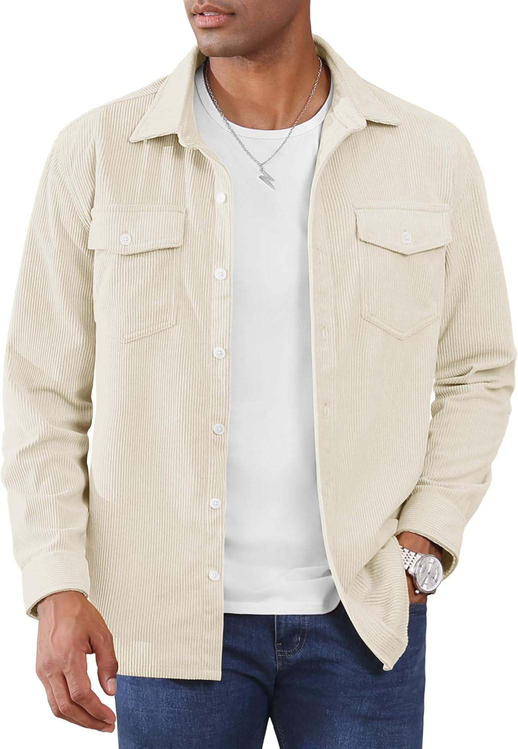Cotrasen Men's Corduroy Shirt Jacket Button Down Long Sleeve Ribbed Shacket Lightweight Overshirt with Flap Pockets