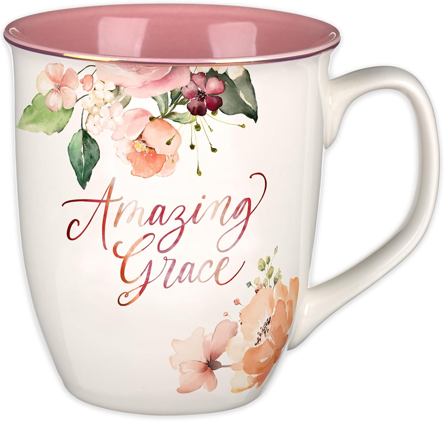 Christian Art Gifts Large Ceramic Inspirational Women's Coffee & Tea Mug: Amazing Grace Encouraging Hymn, Cute Sturdy Rose Gold Novelty Cup, Non-toxic Easy-hold Drinkware, White & Pink Floral, 14 oz.