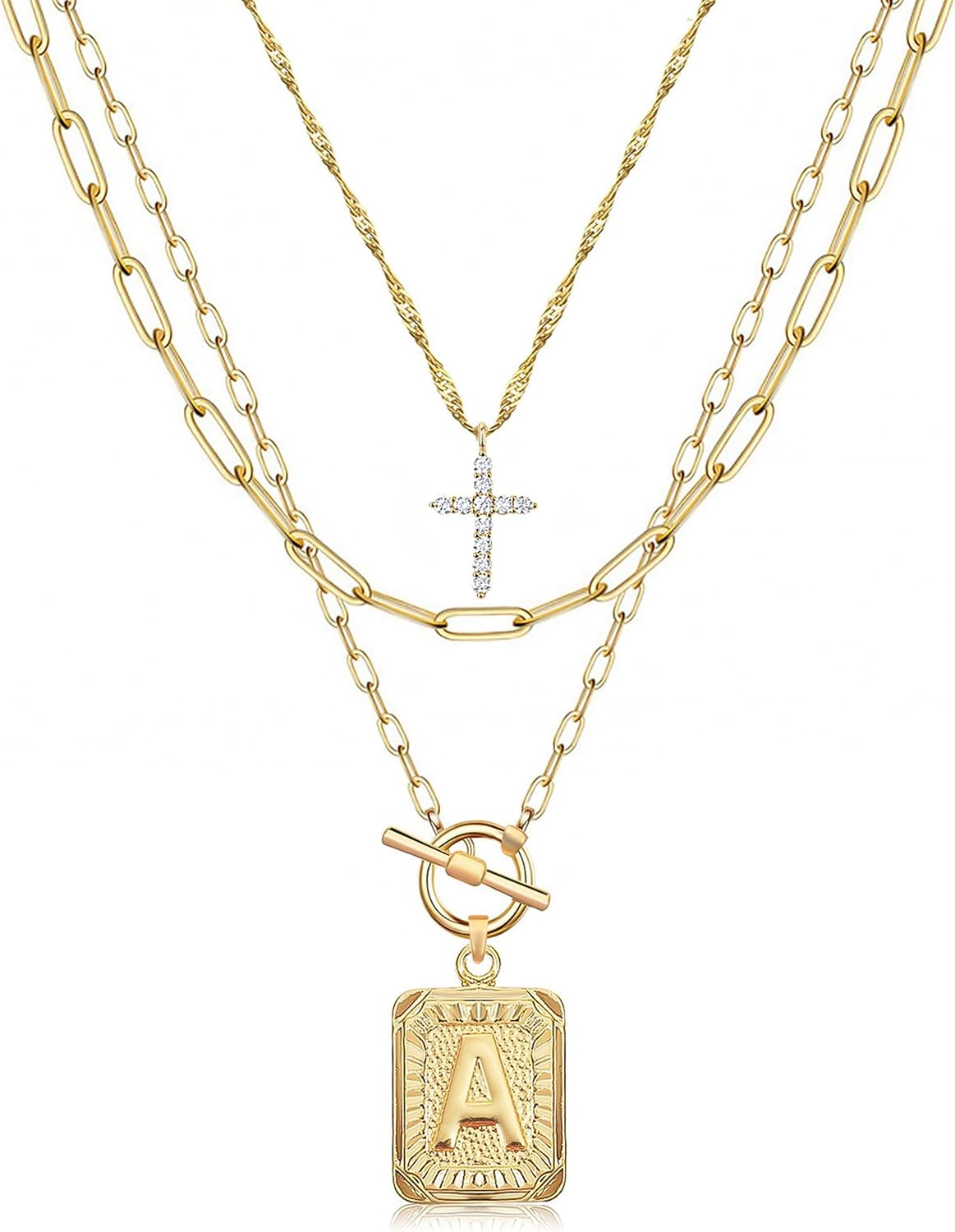 MJartoria Layered Initial Necklaces for Women Trendy, 14K Gold Plated Brass Simple Dainty Cross Choker Square Letter Pendant Necklace, Paperclip Chain Necklaces Jewelry