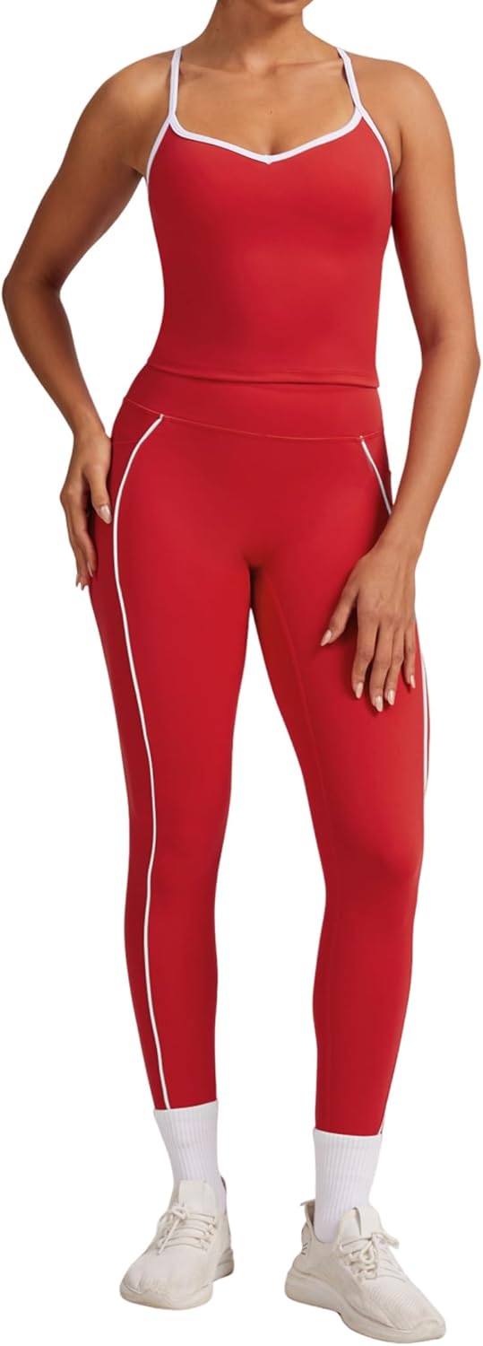 Women 2 Piece Workout Sets Cross Back Color Block Tank Tops Tummy Control Active Leggings Yoga Outfits with Pockets