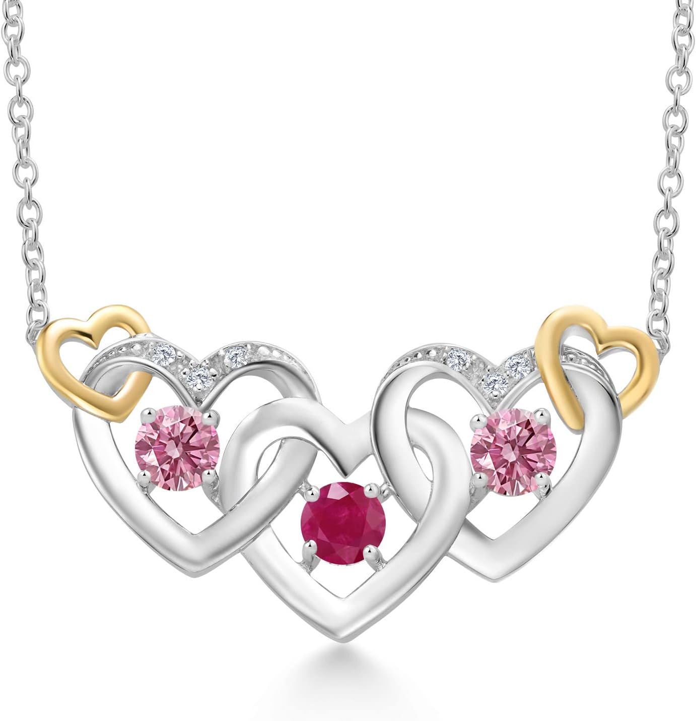 Gem Stone King 925 Silver and 10K Yellow Gold Red Ruby Pink and White Lab Grown Diamond Heart Shape Pendant Necklace For Women (0.91 Cttw, with 18 Inch Chain)