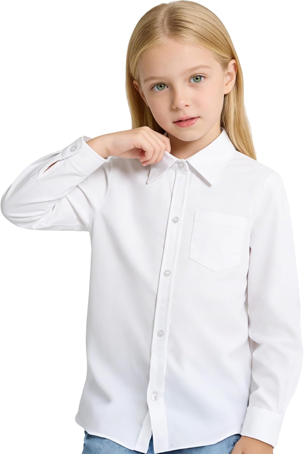 Lolanta Girls Long Sleeve Button Down Shirts Kids Stretch Stain Risistant School Uniform Dress Shirt with One Pocket