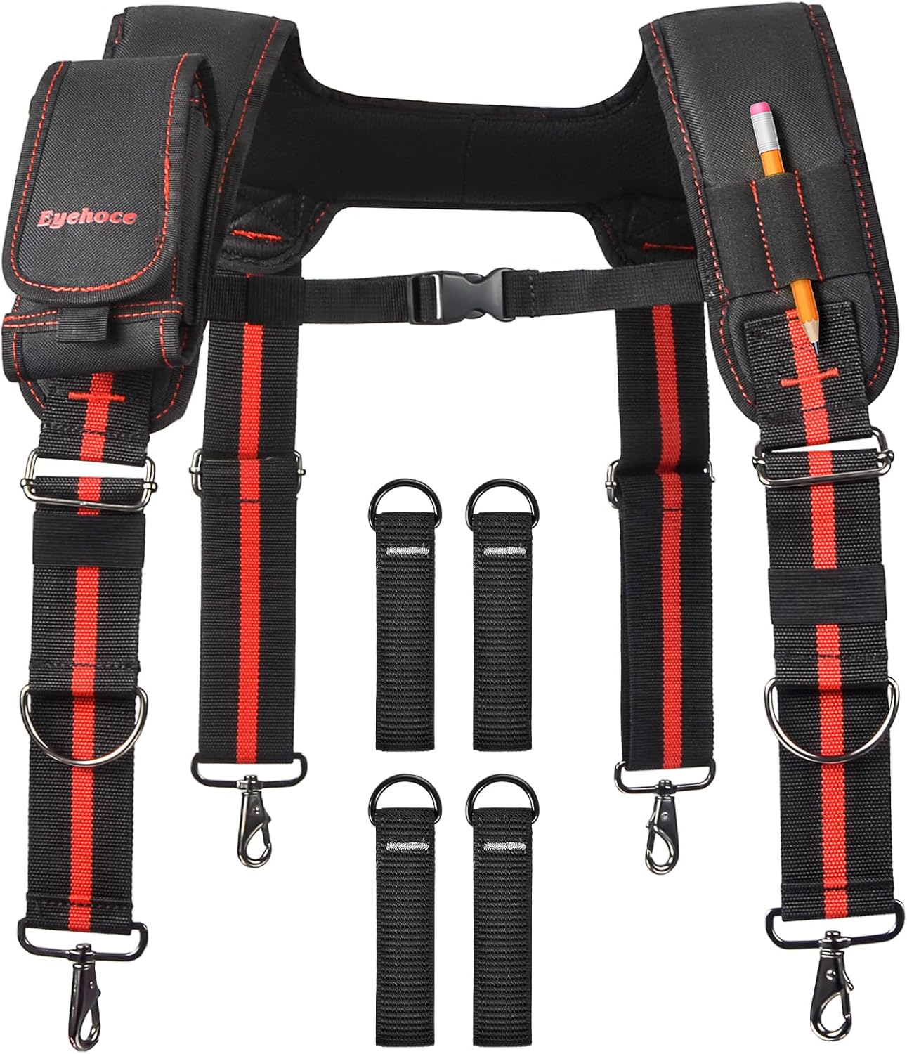 - 💪 Adjustable X-Back Design for Balanced Support - Four-point X-back harness evenly distributes weight and prevents belt sagging. A must-have for electricians, carpenters, and builders.Adjustable work belt suspenders to fit your different needs!
