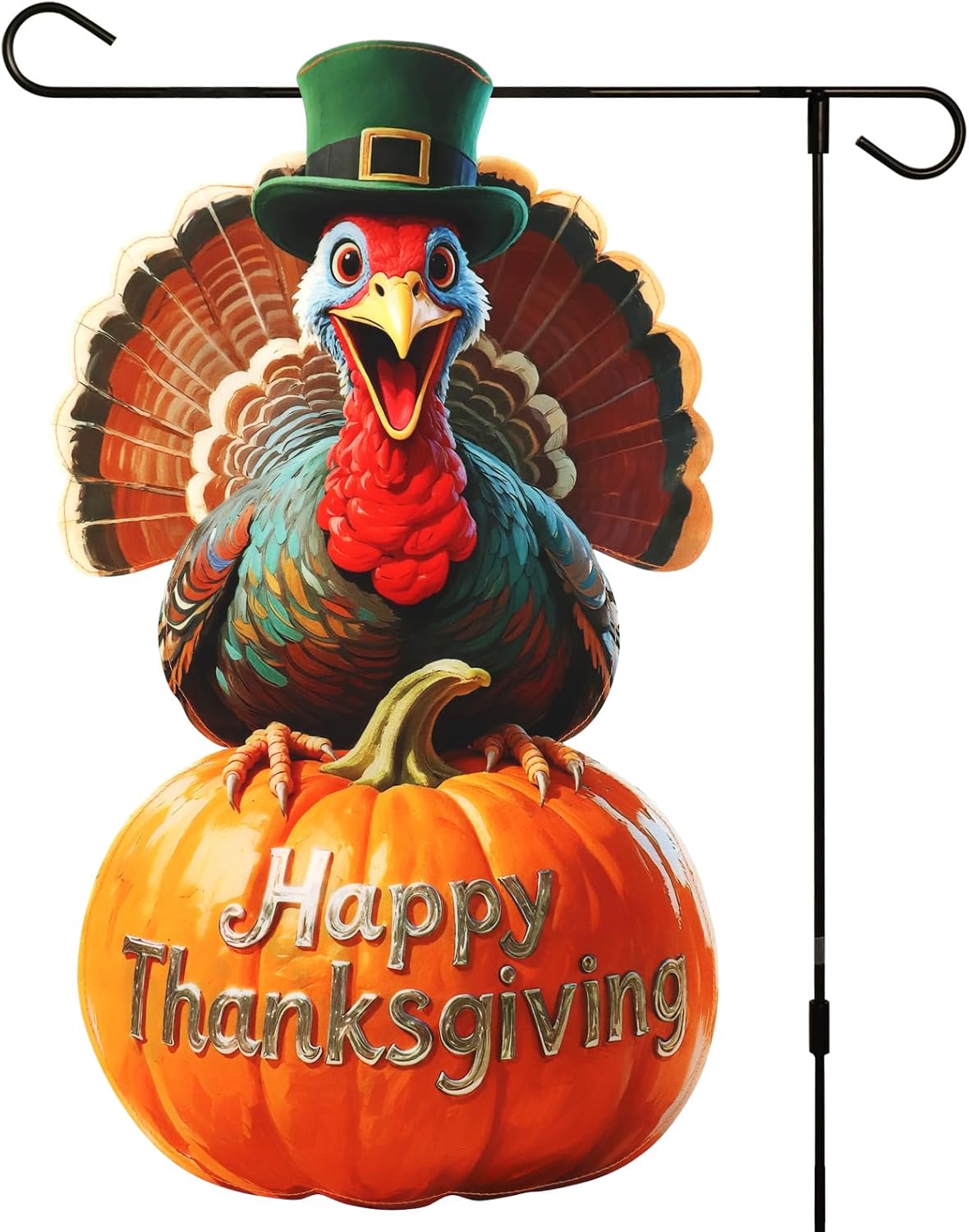 - Celebrate with a unique turkey-shaped garden flag! This eye-catching die-cut flag features a cheerful turkey in a green hat sitting on a pumpkin. The pre-printed "Happy Thanksgiving" message ensures instant festive charm for your fall porch decor.