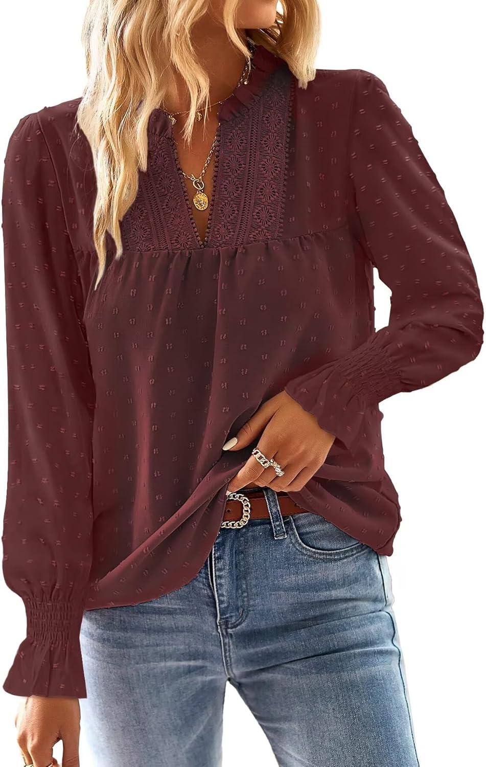 Boho Tops for Women V Neck Blouses Flowy Swiss Dot Dressy Casual Lace Womens Long Sleeve Shirts Trendy 2026