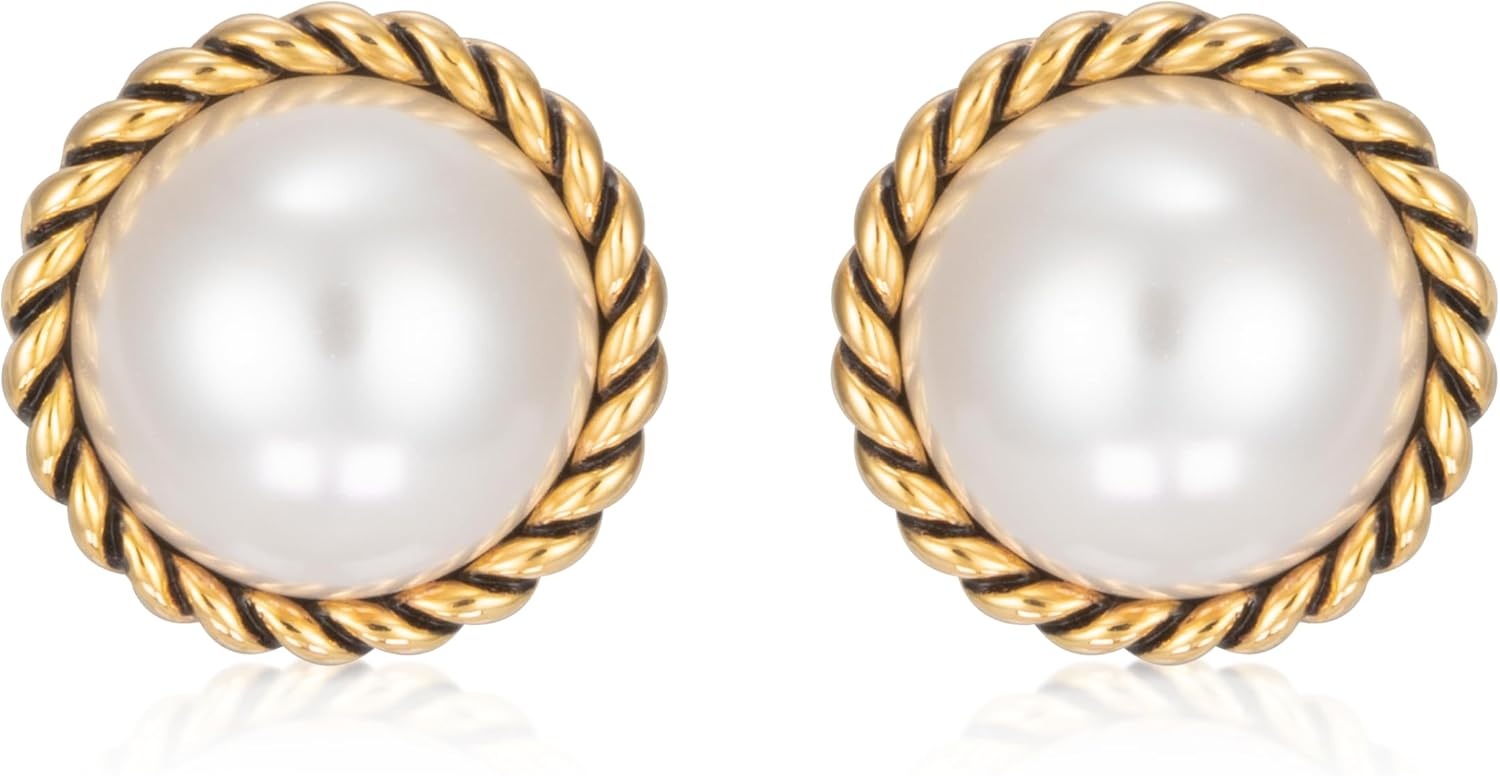 Big Pearl Earrings for Women - Dainty Elegant Gold Statement White Pearl Stud Earrings