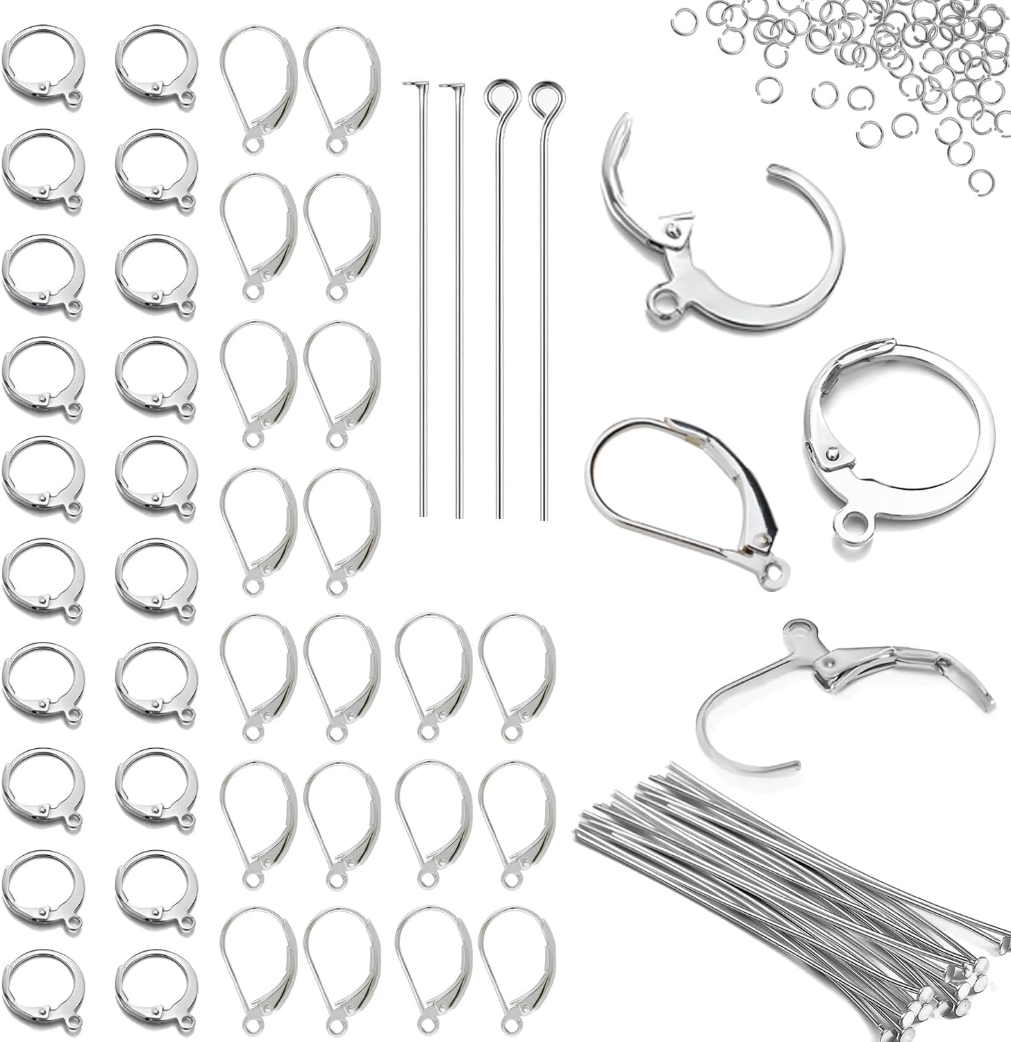 - COMPLETE KIT: 180-piece silver-tone jewelry findings set includes 40 eye pins, 20 D leverback hooks, 20 O leverback hooks, and 100 jump rings for DIY earring making