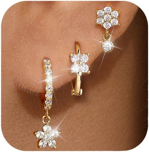 GEORGE · SMITH 3 pairs Flowers earring set for Women, Hypoallergenic Earrings Trendy Versatile Small Earring Stacks Multiple Piercing, 14K Gold plated Stud Huggies earrings for Women