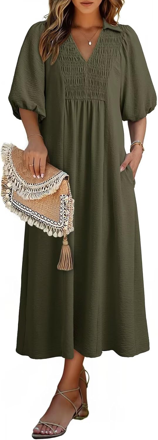Dokotoo Summer Dresses for Women 2026 Casual Dresses V Neck Puff Sleeve Empire Waist A-Line Maxi Dress