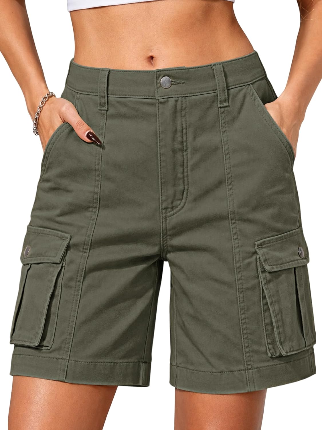 ELLEVEN Bermuda Cargo Shorts Women, Elastic High Waist 6 Pockets Shorts 7 Inch Inseam Summer Jorts for Women Casual