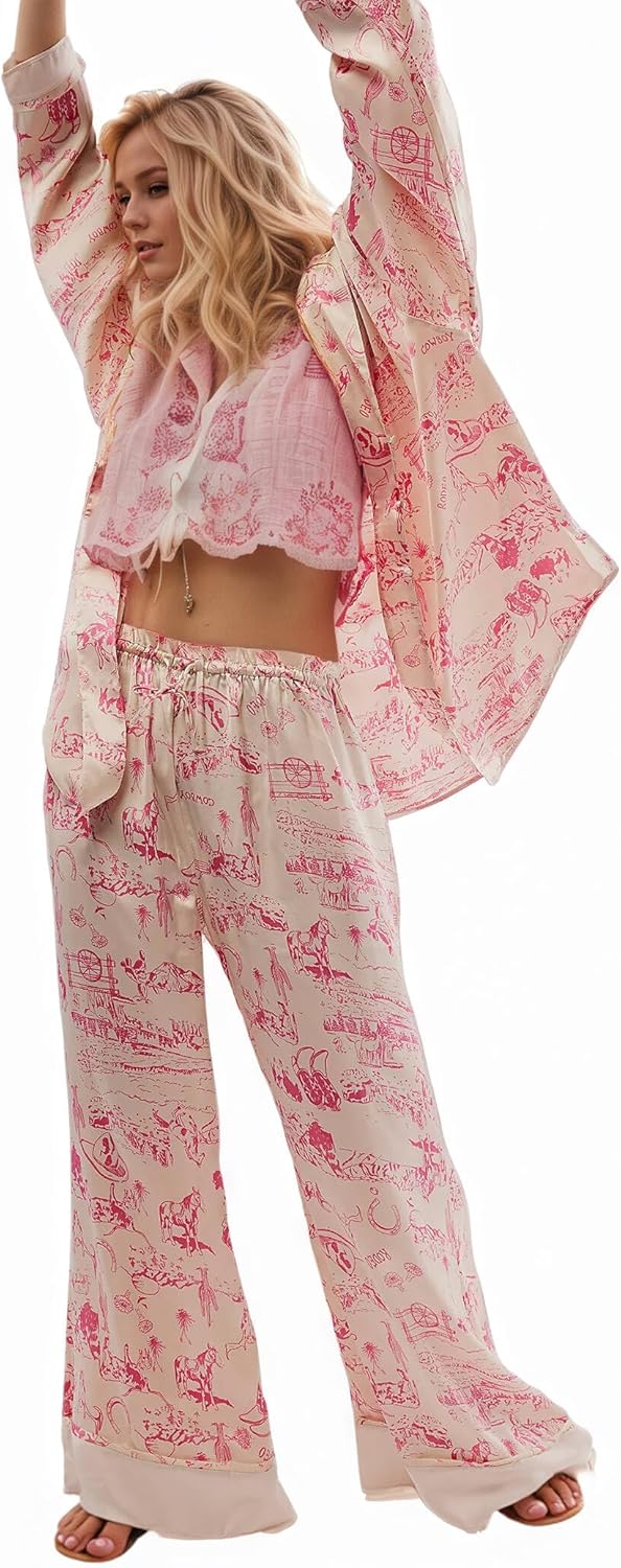 Women's 2-Piece Satin Pajama Set Floral Silk Sleepwear Set Soft Printed Oversized Pajama Lightweight Breathable Pjs