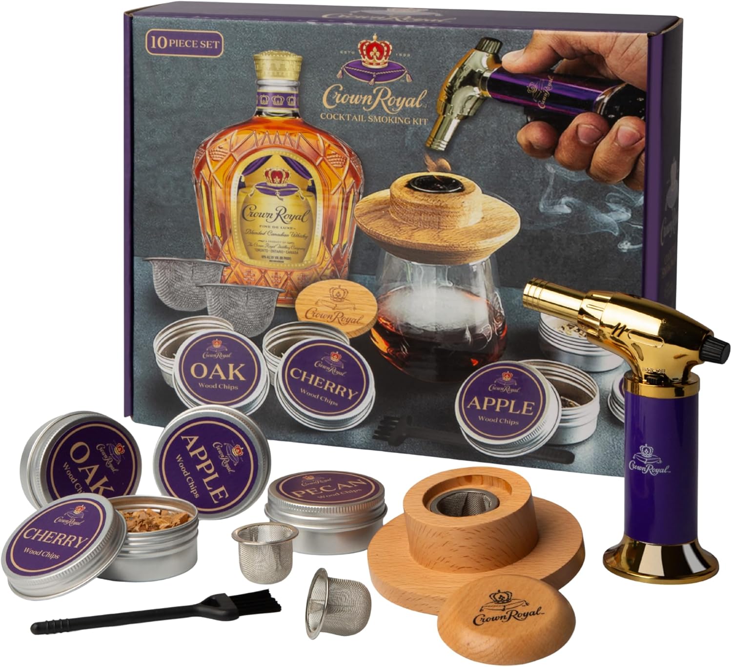 Crown Royal Cocktail Smoking Kit – Premium 10-Piece Whiskey Smoker Set with Butane Torch, Wood Chips (Oak, Apple, Cherry, Pecan), Mesh Burn Cups & Wooden Lid – Gift Set for Whiskey & Bourbon Lovers