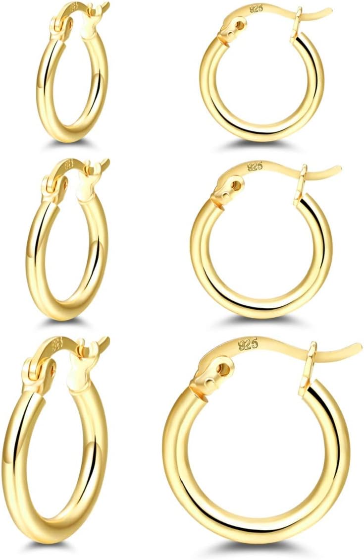 14K Gold Plated Hoop Earrings for Women, 4 Pairs Sterling Silver Post Small Hoops, Gold Huggie Earrings Set for Women Men (13mm 15mm 20mm 25mm)