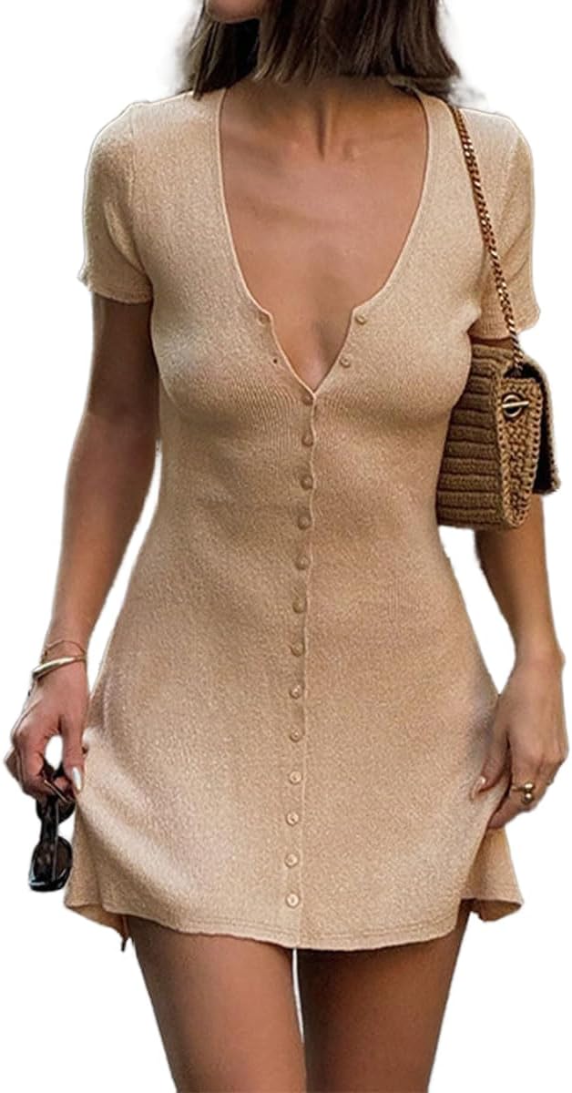 LOFAAC Women Sexy V Neck Button Down Knitted Short Dress Slim Fit Cap Sleeve Flowy Swing Going Out Mini Dress Summer