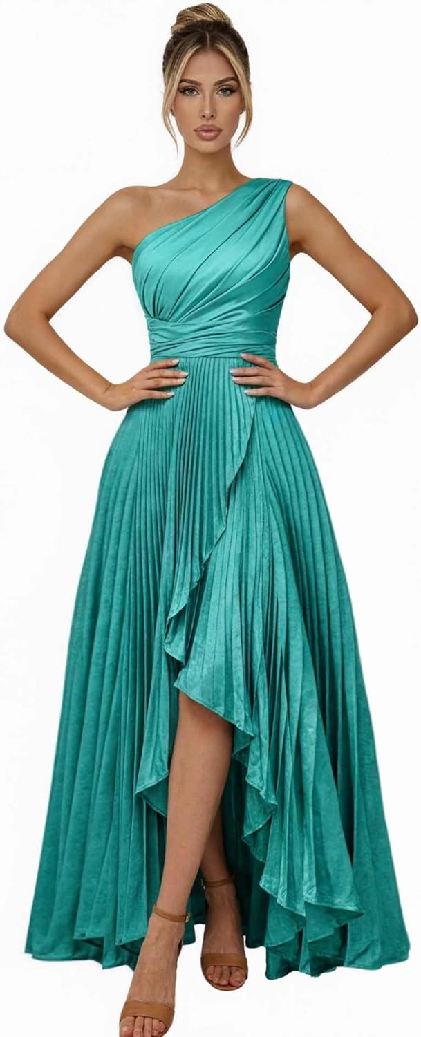 One Shoulder Bridesmaid Dresses for Women Satin Pleated Long A Line Formal Prom Evening Dress with Slit