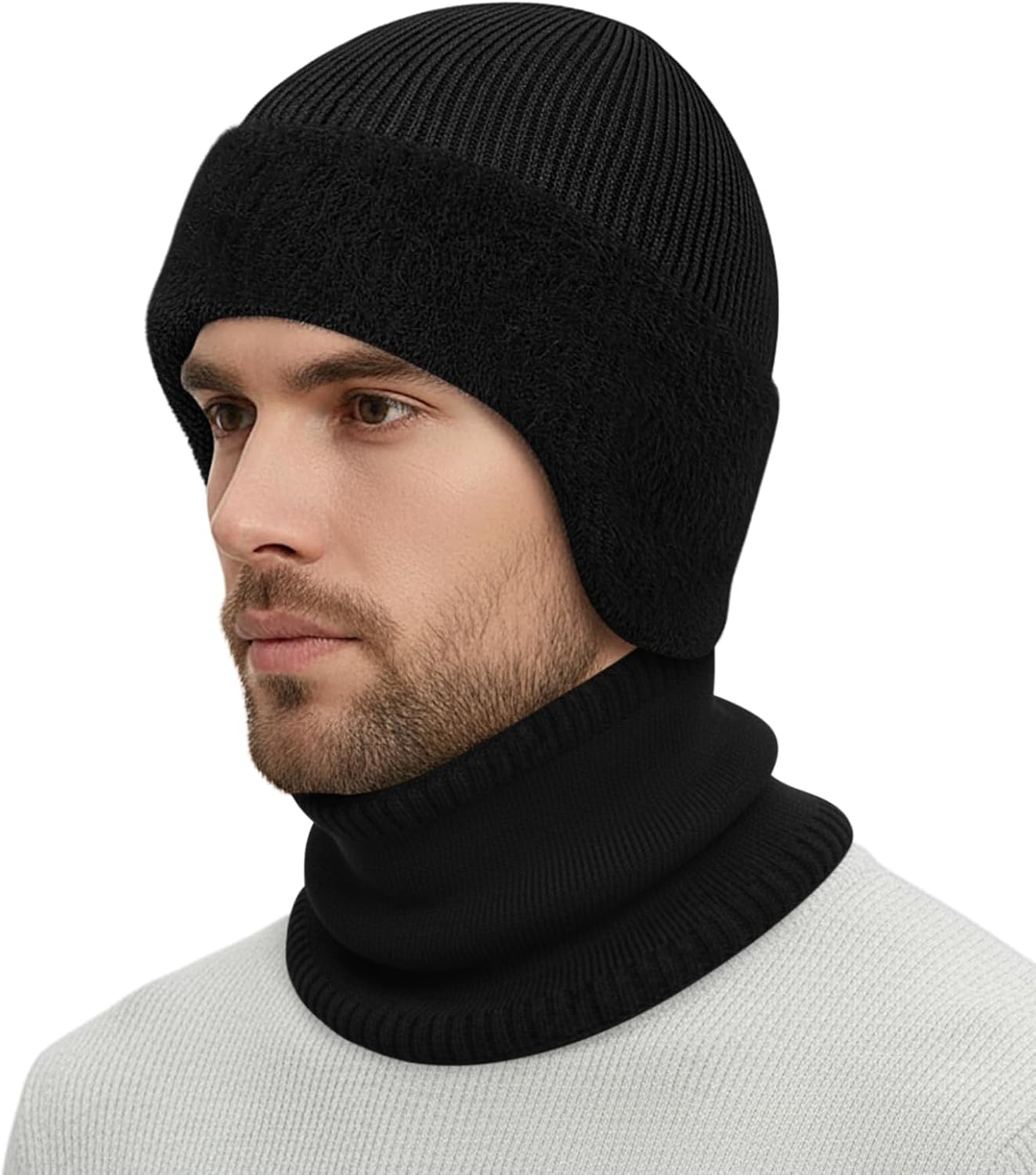 Bencailor Winter Knit Beanie with Earflap Neck Warmer Scarf Set, Thick Windproof Fleece Lined Beanie Scarf Set for Men Women